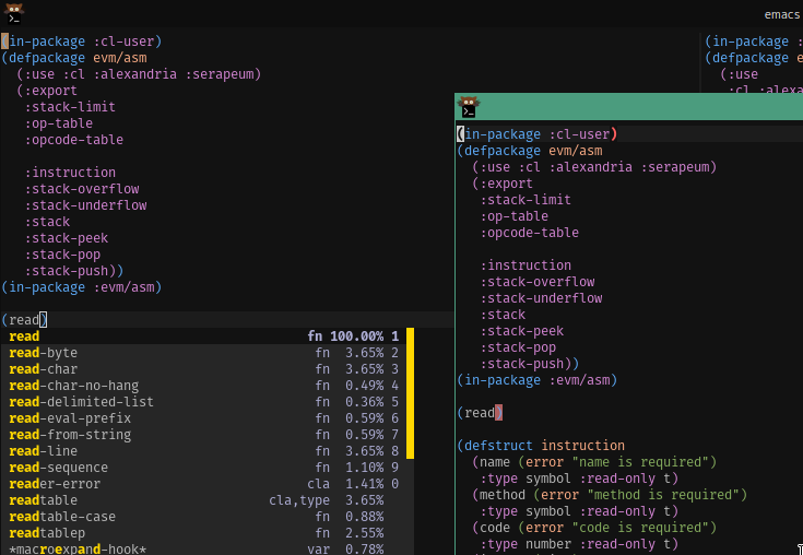 Here you could see how two windows of Emacs with single crdt.el session looks like: